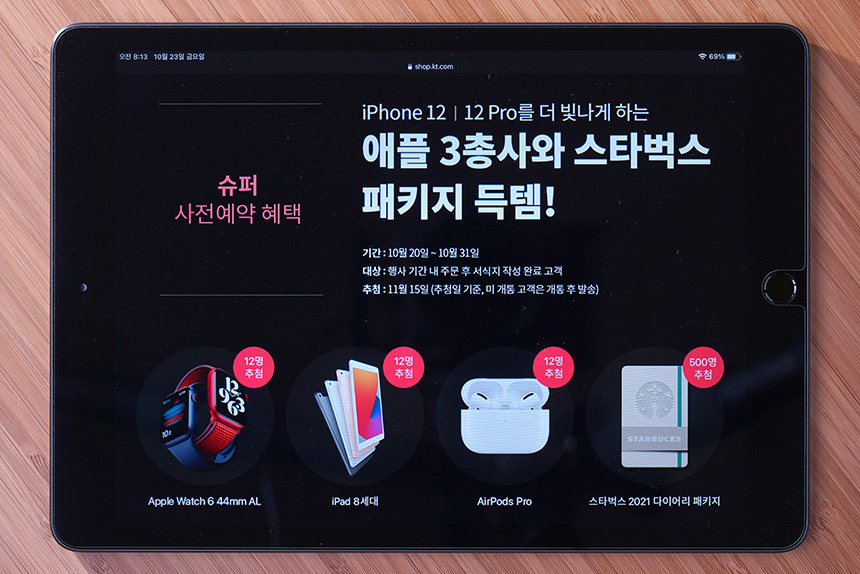 KT에서 제공하는 사전예약 혜택을 확인해 보면 우선 추첨을 통해서 애플워치6 44mm와 아이패드 8세대 그리고 에어팟 프로와 스타벅스 2021 다이어리 패키지가 제공됩니다.