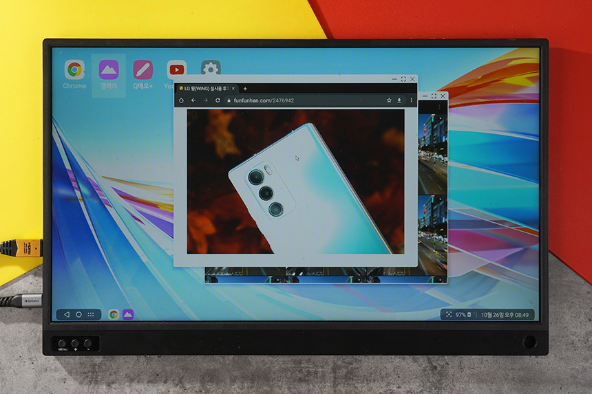 LG 윙(WING)과 모니터나 TV를 연결하면 세컨드 스크린을 터치 패드로 활용할 수 있습니다. 그래서 블루투스 키보드나 마우스 없이도 기본적인 작업은 무리 없이 진행할 수 있습니다.