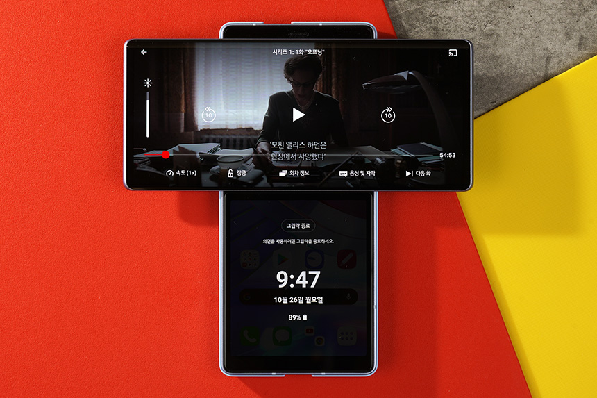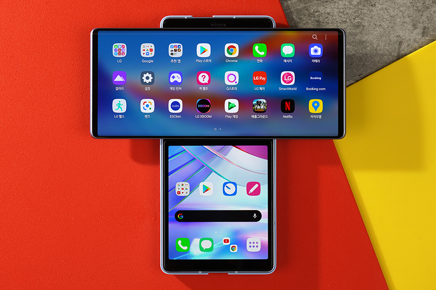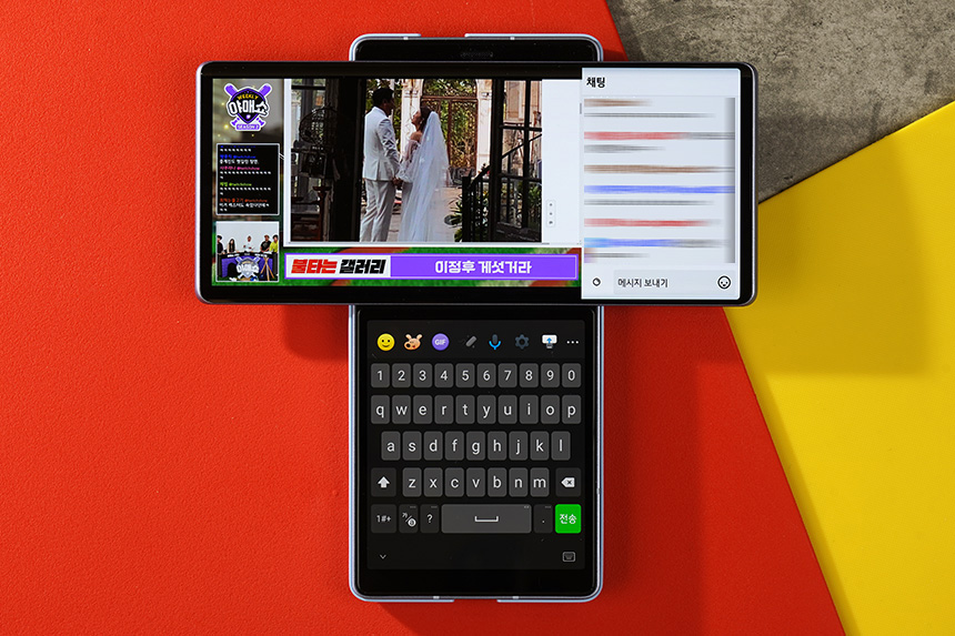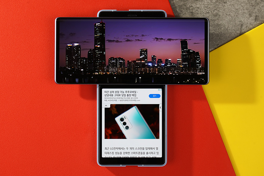 LG 윙(WING)의 가장 큰 차별점은 6.8인치 메인과 3.9인치 서브 듀얼 스크린을 채택하고 있다는 점입니다. 그래서 가로 형태의 콘텐츠를 시청하면서 커뮤니티를 확인하는 등의 용도로 활용할 수 있습니다. 그렇지만 2개의 스크린을 탑재하고 있는 제품의 특성상 무게는 약 260g으로 약간 묵직한 느낌을 주는 편입니다.