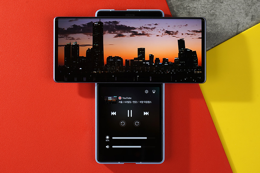 LG 윙(WING)의 메인 스크린에서 유튜브나 자체 동영상 기능을 실행시키면 세컨드 스크린에 미디어 컨트롤러를 배치할 수 있습니다. 특히 앞뒤로 영상을 스킵할 수 있다는 점이 편리했습니다.