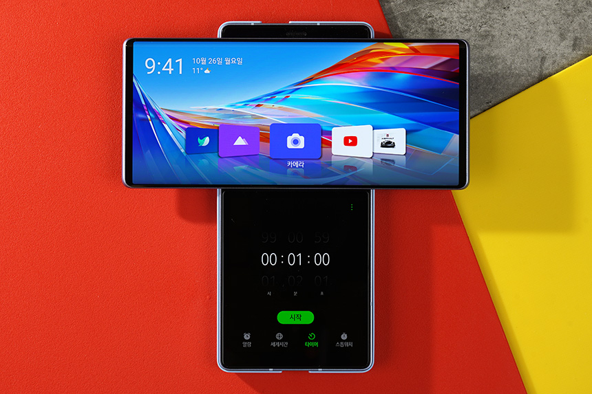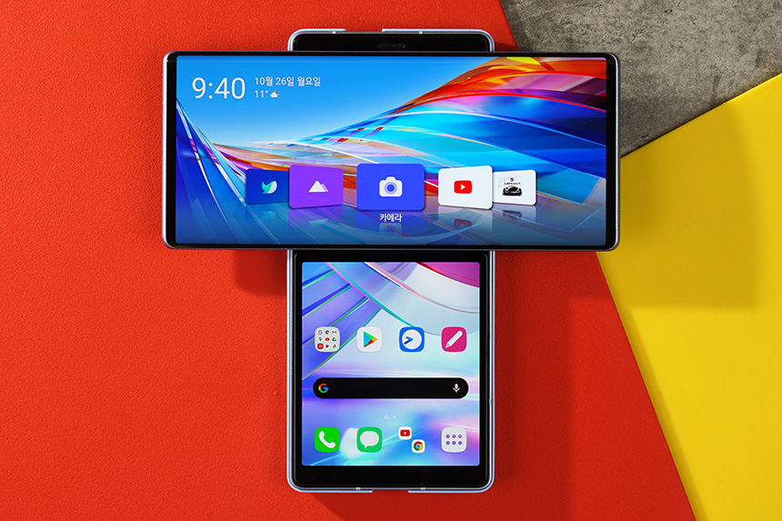 LG 윙(WING)의 가장 큰 차별점은 6.8인치 메인과 3.9인치 서브 듀얼 스크린을 채택하고 있다는 점입니다. 그래서 가로 형태의 콘텐츠를 시청하면서 커뮤니티를 확인하는 등의 용도로 활용할 수 있습니다. 그렇지만 2개의 스크린을 탑재하고 있는 제품의 특성상 무게는 약 260g으로 약간 묵직한 느낌을 주는 편입니다.