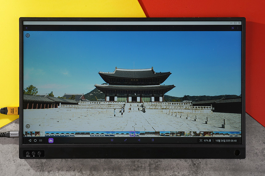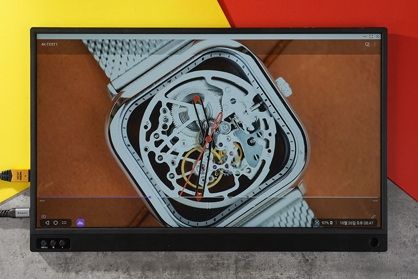 제가 유용하다고 생각했던 기능은 그립락 기능입니다. 세컨드 스크린 자체를 손잡이로 활용할 수 있는데요. 더욱 편리하게 동영상을 감상할 수 있습니다. 그리고 화면을 터치하면 시간 등의 정보들이 표시됩니다.