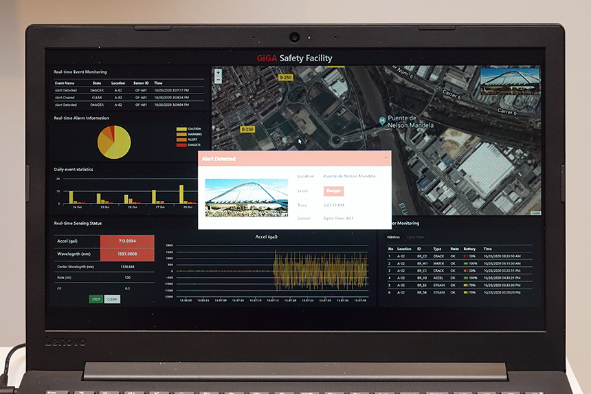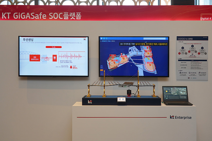 KT Digital-x Summit 2020 행사장에는 모형 교량이 준비되어 있었는데요. 버튼을 누르면 진동이 전달되고 옆쪽에 배치된 노트북에 즉시 알림과 함께 관련 정보가 표시되었습니다. 직관적으로 서비스를 이해할 수 있는 구조물이라고 생각되었습니다.
