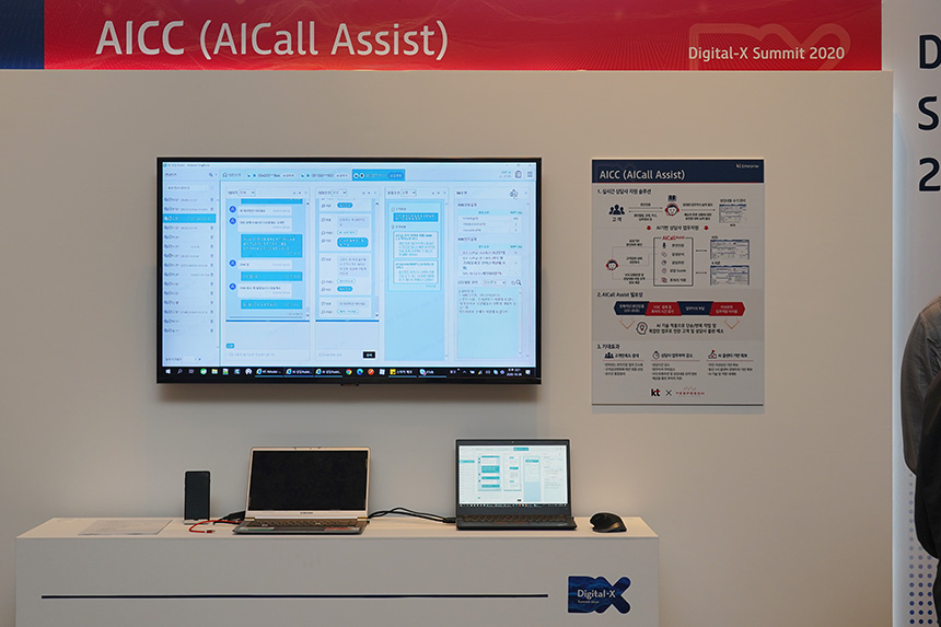 우선 중앙의 대형 스크린을 중심으로 왼쪽에는 KT GiGA Safe SOC와 온라인교육 서비스 플랫폼이 배치되어 있었고 오른쪽에는 KT Digital Works와 AICC(AlCall Assist) 서비스를 시연하는 부스가 준비되어 있었습니다.