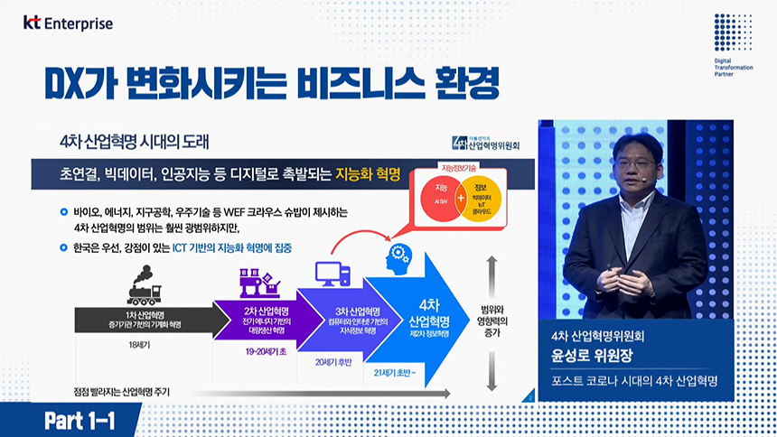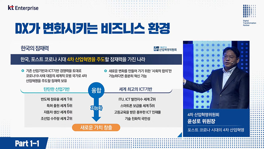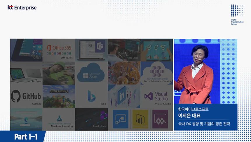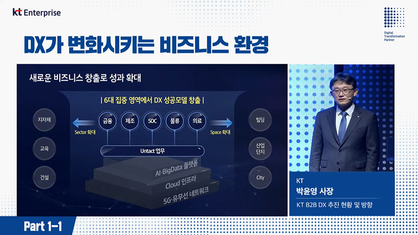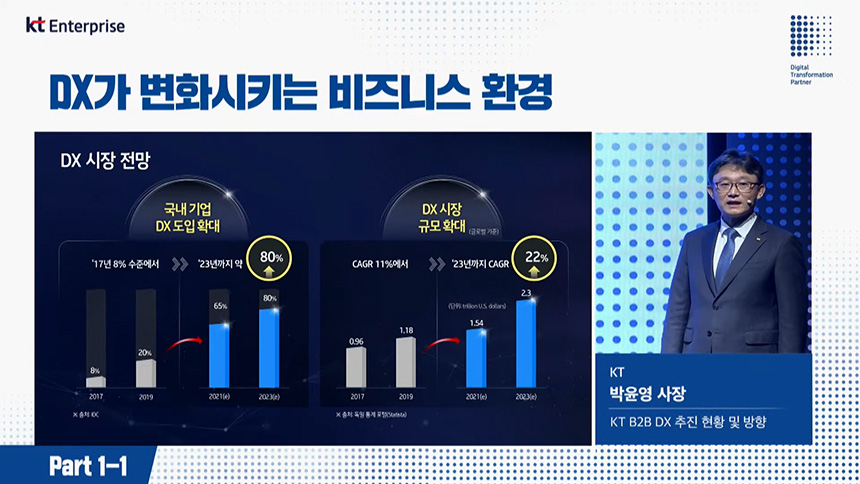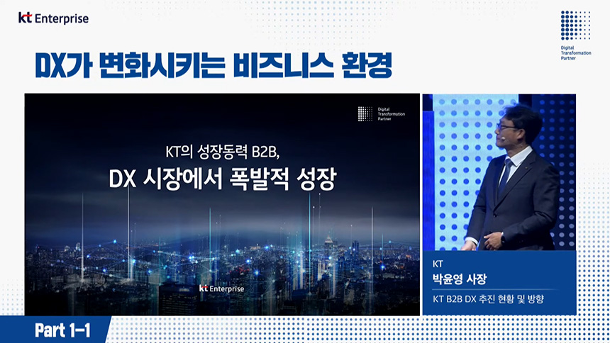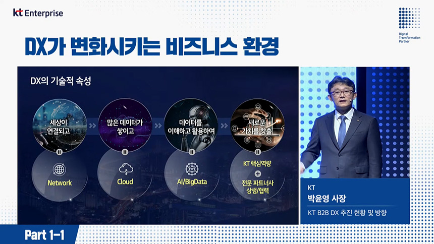 오전 컨퍼런스(Part1-1)는 “DX가 변화시키는 비즈니스 환경”이라는 주제로 진행되었고 첫 번째 섹션은 디지털 전환(DX)을 총괄하고 있는 박윤영 KT 기업부분 사장님께서 “KT B2B DX 추친 현황 및 방향”에 대해서 알려주었습니다.