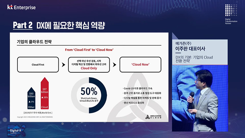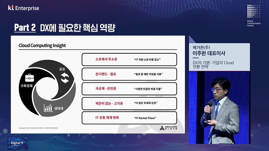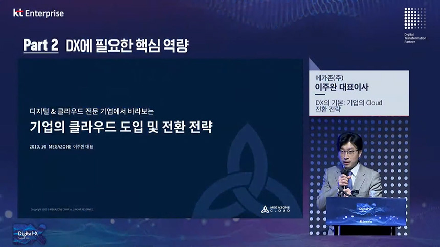 세 번째 섹션은 “DX 기본: 기업의 Cloud 전환 전략”이라는 토픽으로 메가존 이주완 대표이사님께서 세미나를 진행해주셨습니다. 클라우드는 디지털 전환(DX)의 핵심 요소 중의 하나라고 할 수 있습니다.