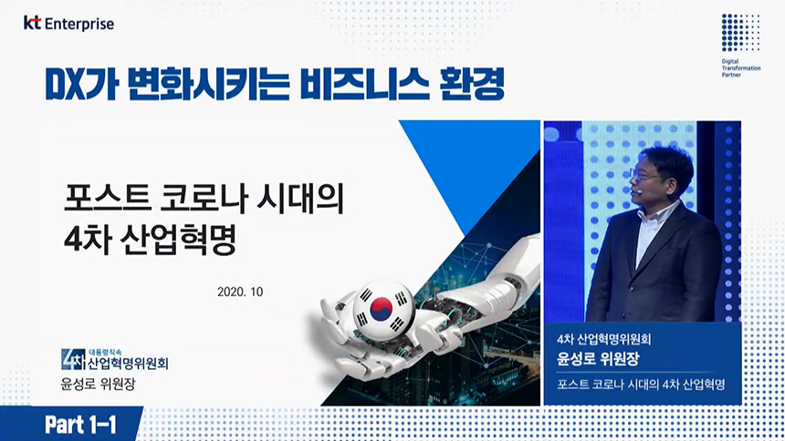 두 번째 섹션은 “포스트 코로나 시대의 4차 산업혁명”이라는 주제로 4차 산업혁명위원회 윤성로 위원장님께서 발표를 진행해주셨습니다. 참고로 위원회에서 정의하는 4차 산업혁명은 “인공지능, 빅데이터 등 디지털 기술로 촉발되는 초연결 기반의 지능화 혁명”이라고 합니다.