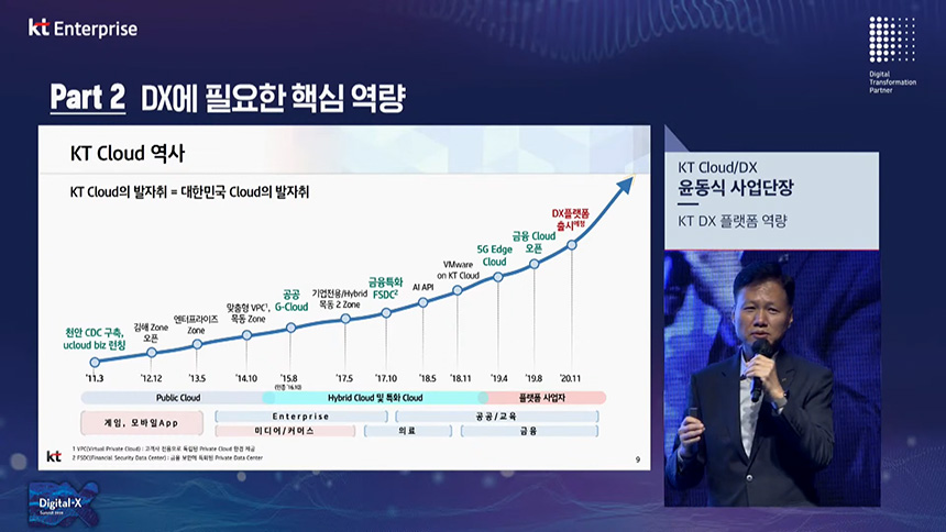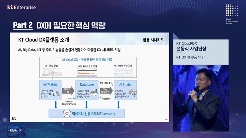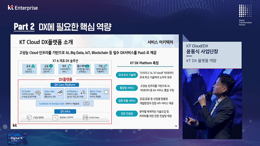 오후 컨퍼런스는 “DX 성장에 필요한 핵심역량(Part2)”이라는 주제로 진행되었고 첫 번째 섹션은 윤동식 KT 사업단장님이 “KT DX 플랫폼 역량”에 대해서 설명해 주셨습니다.