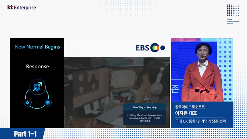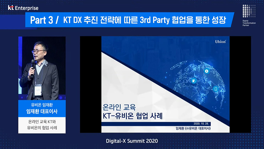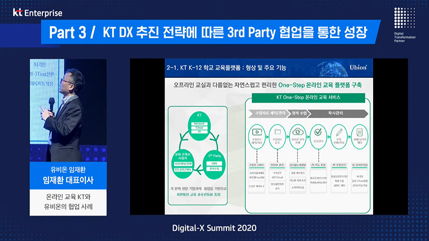 두 번째 섹션은 “온라인교육 KT-유비온 협력 사례”라는 내용으로 임재환 유비온 대표이사님께서 세미나를 진행해주셨습니다. 원격교육은 코로나 19 시대에 가장 큰 주목을 받고 있습니다.