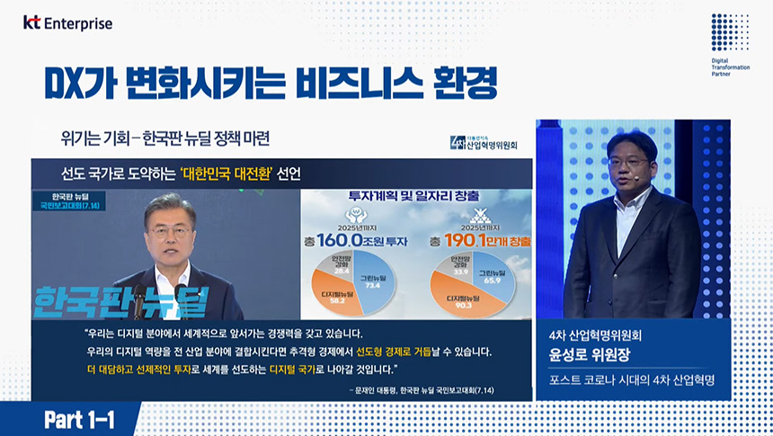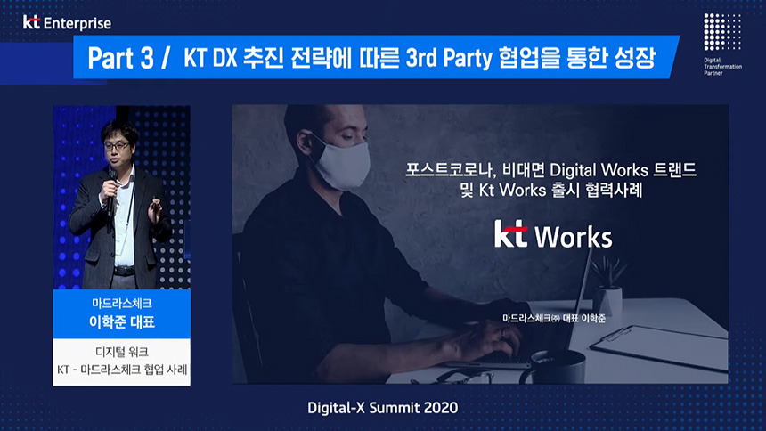 Digital-x Summit 2020를 통해서 우리는 갑작스럽게 시작된 코로나 19 팬데믹 시대에 기업들의 디지털 전환(DX)은 이제는 선택이 아닌 필수라는 점을 다시 한번 확인할 수 있습니다. 특히 KT는 오랜 시간 네트워크와 인공지능 그리고 빅데이터와 클라우드 부분에서 강점이 있으므로 회사의 디지털 트랜스포메이션 전략이 고민이신 분들은 KT의 솔루션을 한 번 살펴보시길 바랍니다.