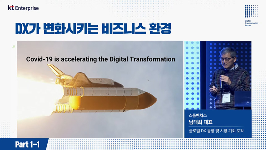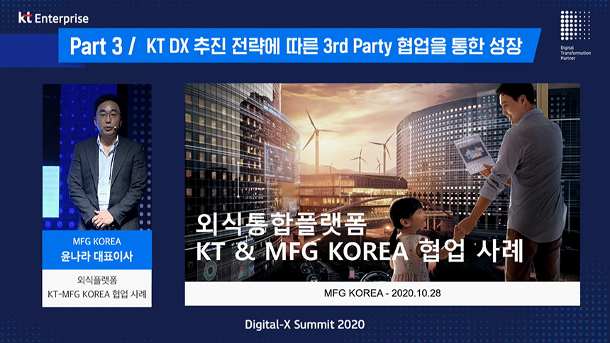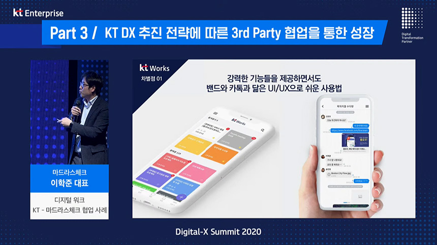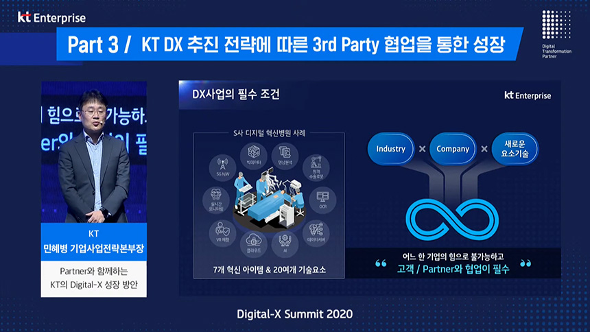 파트3은 “3rd Party 협업을 통한 성장”이라는 주제로 컨퍼런스가 진행되었고 첫 번째 섹션은 민혜병 KT 기업사업전략본부장님께서 “형업과 상생을 통한 DX 성장방안”이라는 주제로 발표를 진행해주셨습니다.