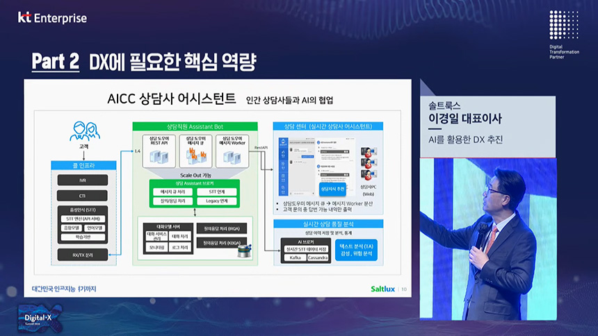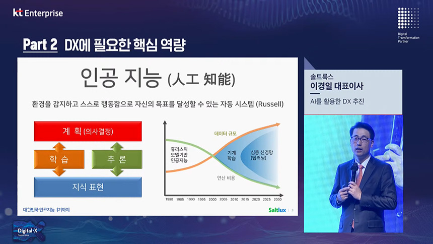 두 번째 섹션은 “AI를 활용한 DX 추진”이라는 주제로 솔트룩스 이경일 대표이사님께서 발표를 진행해주셨습니다. 솔트룩스는 인공지능과 빅데이터 기술에 기반을 둔 4차산업혁명 원천기술 기업입니다.