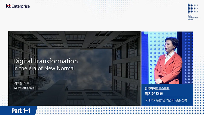 오전 컨퍼런스의 마지막 발표는 “국내 DX 동향 및 기업의 생존 전략”이라는 주제로 이지은 한국 마이크로소프트 대표님께서 진행을 해주셨습니다. 참고로 MS의 CEO인 사티아 나델라는 코로나 19로 인해서 2년 동안 진행될 디지털 전환(DX)이 2달 만에 진행되고 있다는 이야기를 한 적이 있다고 합니다.