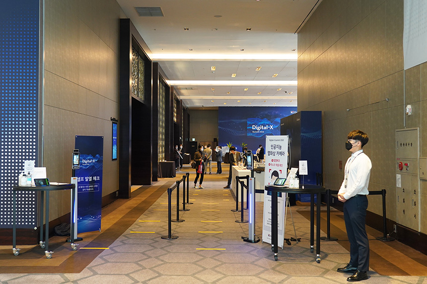 행사장의 입구에는 체온을 측정하고 QR코드 전자출입명부를 입력할 수 있는 장치들이 준비되어 있었습니다. 코로나 19 팬데믹 초기에는 종이에 인적 사항을 적어야 했고 관련 문제도 많았지만, 디지털화가 진행될수록 점차 편리해지고 있습니다.