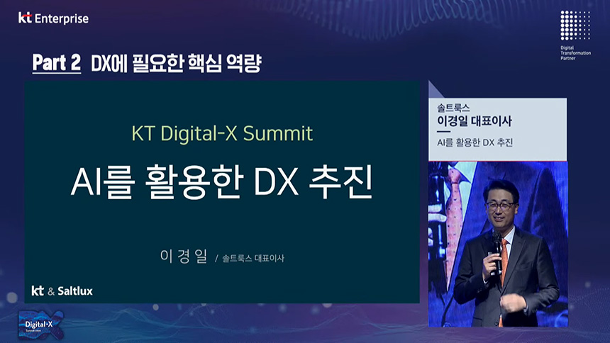 두 번째 섹션은 “AI를 활용한 DX 추진”이라는 주제로 솔트룩스 이경일 대표이사님께서 발표를 진행해주셨습니다. 솔트룩스는 인공지능과 빅데이터 기술에 기반을 둔 4차산업혁명 원천기술 기업입니다.