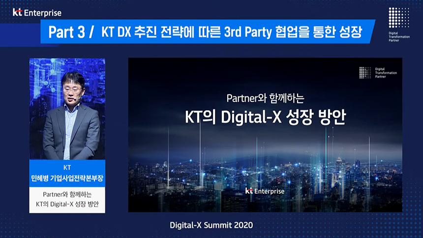파트3은 “3rd Party 협업을 통한 성장”이라는 주제로 컨퍼런스가 진행되었고 첫 번째 섹션은 민혜병 KT 기업사업전략본부장님께서 “형업과 상생을 통한 DX 성장방안”이라는 주제로 발표를 진행해주셨습니다.