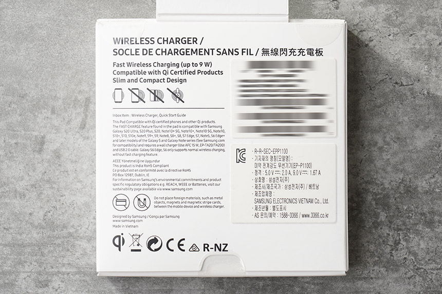 박스의 뒷면을 살펴보면 정격 5V/2A, 9V/1.67A를 지원한다는 것을 확인할 수 있습니다. 그리고 Qi 규격의 스마트폰들을 충전시켜 줄 수 있도록 설계되었습니다. 그리고 스마트워치는 충전되지 않는다는 문구가 표시되어 있습니다. 조금 더 확인해 필요해 보입니다.