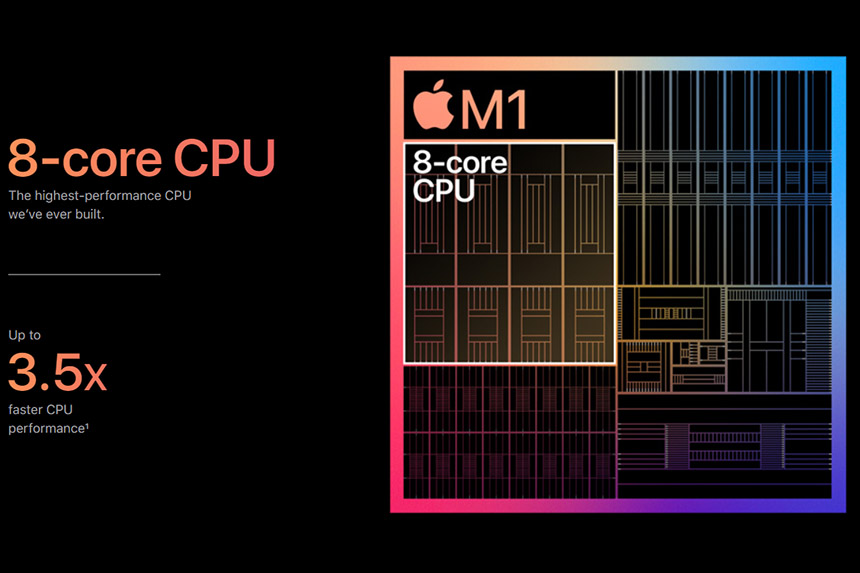 애플 실리콘 M1 프로세서는 8코어 구성되어 있습니다. 그리고 기존 제품 대비 3.5배 정도 빠르다고 하는데요. 아마도 자사에 탑재되었던 가장 저가 라인업과 비교를 한 것으로 보입니다.