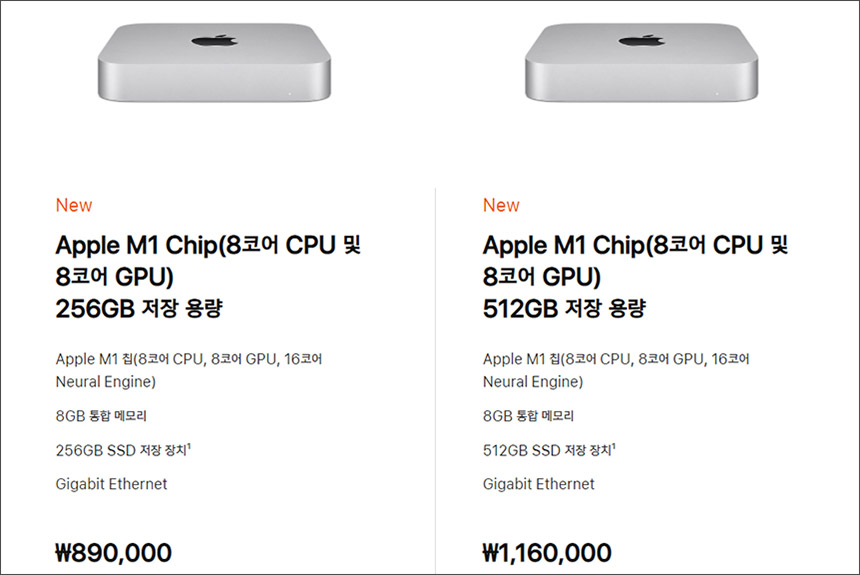 애플 실리콘 M1 프로세서 탑재 맥 미니는 8GB 메모리와 기가비트 이더넷을 탑재하고 있습니다. 썬더볼트 등을 내장한 맥북 시리즈와 비교하면 스펙이 약간 부족한 것 같습니다. 그리고 가격은 SSD 저장 장치 용량에 따라서 89만원과 116만원으로 책정되었습니다.