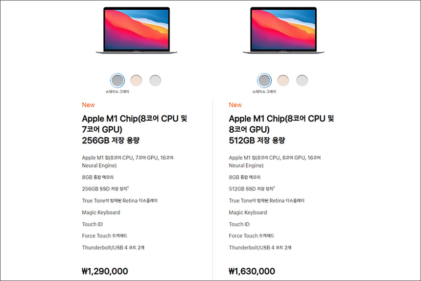 애플 실리콘 M1 프로세서 탑재 맥북 에어의 스펙을 확인해 보면 13.3인치 2560 X 1600 해상도의 레티나 디스플레이와 가위식 메커니즘의 매직 키보드 등을 탑재했습니다. 그리고 가격은 256GB 용량 제품이 129만원, 512GB 용량 제품은 163만원입니다.