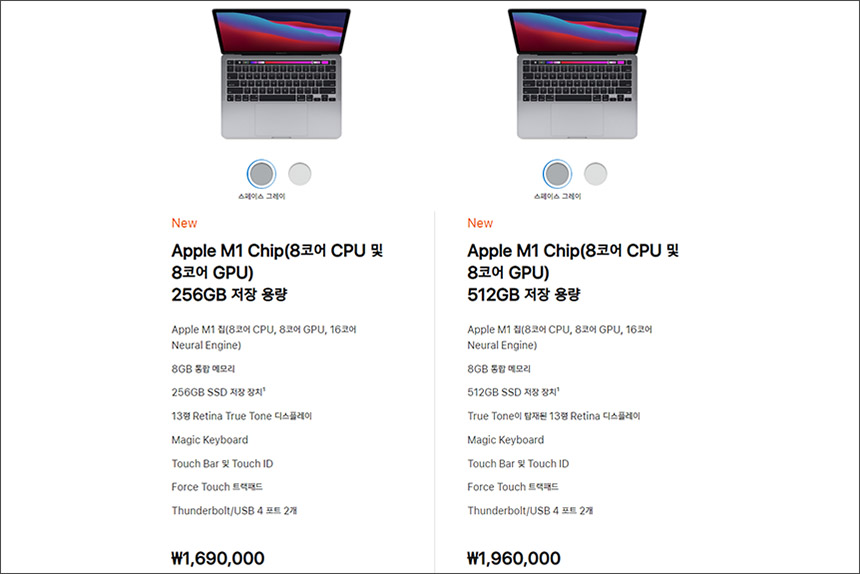 맥북 프로의 스펙을 확인해 보면 애플 실리콘 M1 프로세서와 13.3인치 레티나 디스플레이를 탑재했습니다. 그리고 터치바와 터치 아이디, 포스터치 트랙패드 등을 내장했습니다. 가격은 256GB 내장 메모리 모델이 169만원, 512GB 모델은 196만원으로 책정되었습니다.