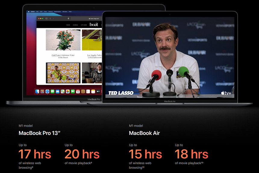 그리고 배터리 성능의 경우에는 맥북 프로나 맥북 에어 기준으로 약 3시간 정도 향상이 있는 것을 확인할 수 있습니다. 아무래도 모든 구성 요소들이 통합되어 있어서 사용 시간이 증가한 것 같습니다.