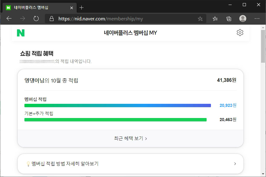 해지를 선택하면 네이버 플러스 멤버십를 통해서 현재까지 받은 적립 내용이 표시됩니다. 여기에서 한달에 10만원 이상 네이버 쇼핑에서 물건을 구입하는지는 잘 고민해 보아야 합니다.