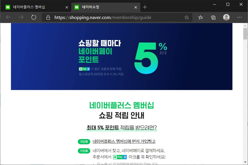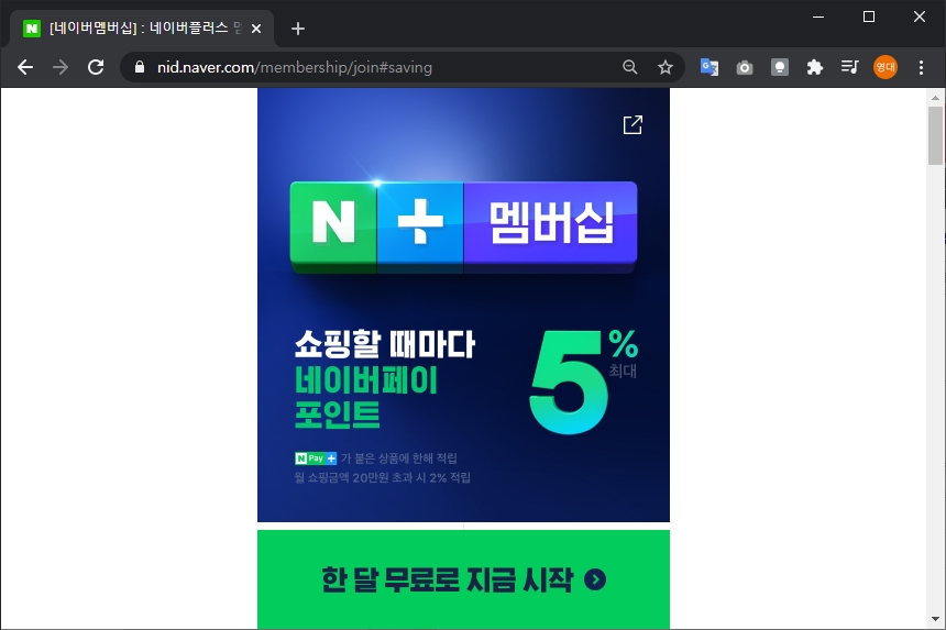 네이버 플러스 멤버십에 가입하는 방법은 간단합니다. 아래 링크를 통해서 “한 달 무료로 지금 시작” 버튼을 눌러주면 됩니다. 그리고 핵심 혜택은 쇼핑할 때 네이버페이 포인트로 5%(20만원 초과시 2%)를 환급받을 수 있다는 점입니다.