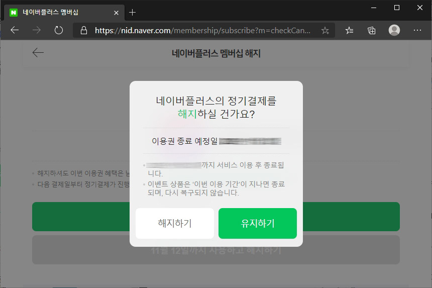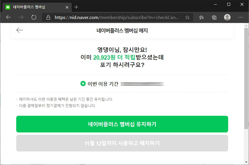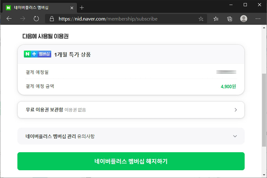 그리고 네이버 플러스 멤버십를 해지하면 바로 사용 정지가 되는 것은 아니고 결제 기간까지는 혜택이 유지됩니다. 그리고 나중에 언제라도 다시 등록할 수 있습니다. 편리한 부분 중의 하나입니다.