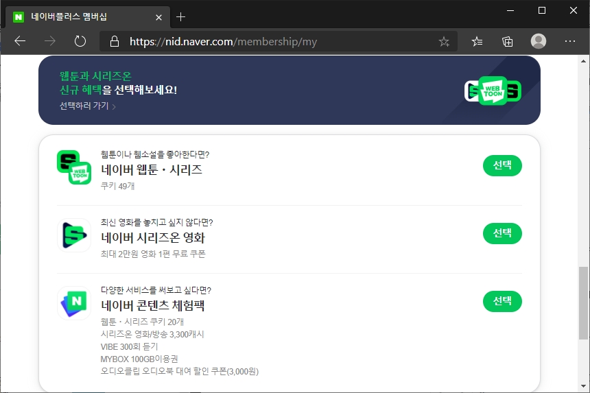 그리고 다른 부가적인 혜택으로 웹툰이나 시리즈 쿠키 49개 혹은 네이버 시리즈온 영화 1편 무료 네이버 콘텐츠 체험팩 중에서 하나를 선택할 수 있습니다. 의외로 나쁘지 않은 편이라고 할 수 있습니다.