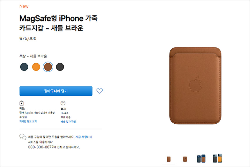 마지막으로 MagSafe형 iPhone 가죽 카드지갑도 같이 공개되었습니다. 자석을 이용해서 아이폰 12에 고정할 수 있도록 설계되었습니다. 그런데 자력이 조금 약한 편이어서 관련 리뷰를 확인해보면 단단하게 부착되어 있는 것 같지는 않습니다.