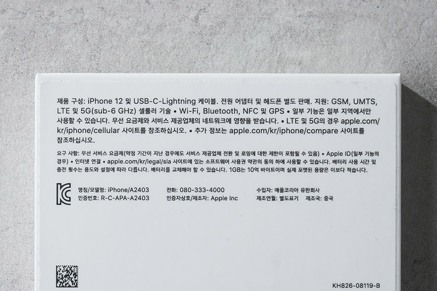 박스의 뒷면을 살펴보면 애플 아이폰 12 블루의 구성품이 설명되어 있습니다. 핵심은 전원 어댑터와 헤드폰이 별도로 판매된다는 점입니다. 일부 사용자들에게는 조금 아쉬울 수 있는 부분이라고 생각되었습니다.