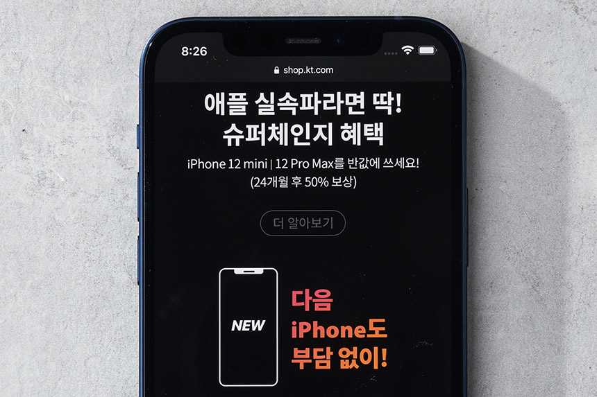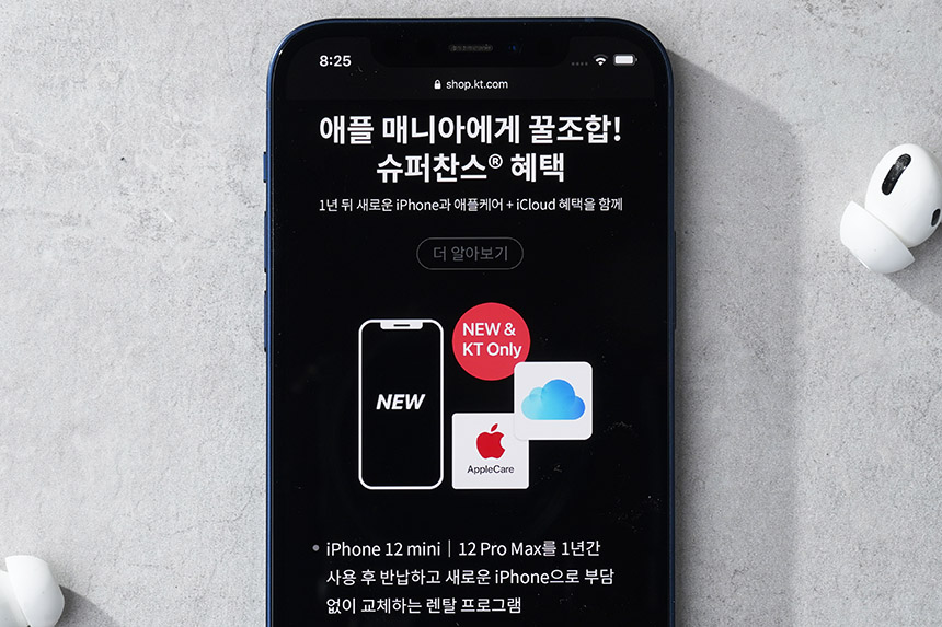 KT에서는 슈퍼찬스라는 서비스를 제공하고 있는데요. 가입 후에 아이폰 12 미니와 PRO MAX를 1년간 사용하고 반납하고 새로운 아이폰으로 교체할 수 있습니다. 매년 최신 제품을 사용하기 원하는 분들에게 유용할 것 같습니다.