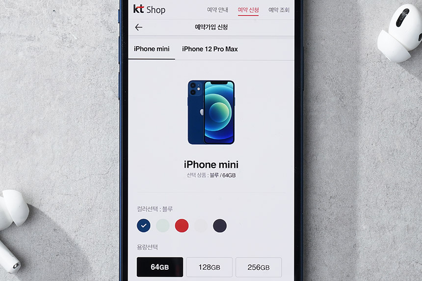 KT에서 사전예약을 진행하는 방법은 간단합니다. 우선 아이폰 12 MINI나 PRO MAX 중에서 선택을 한 후에 컬러와 용량을 결정하면 됩니다. 저는 사진이나 영상을 많이 촬영하는 분들에게는 128GB 이상 모델을 추천합니다.