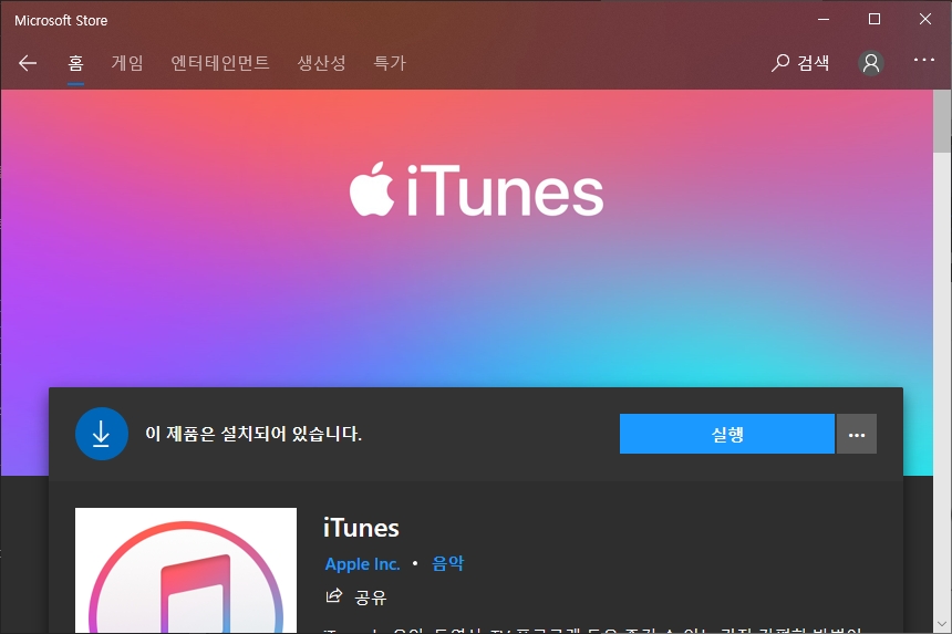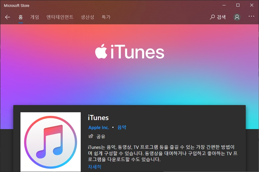 아이튠즈는 애플 홈페이지는 물론이고 윈도우10 마이크로소프트 스토어에서도 다운로드를 받을 수 있습니다. 나중에 업데이트 등의 관리를 위해서는 Microsoft Store에서 설치하는 것을 추천합니다.