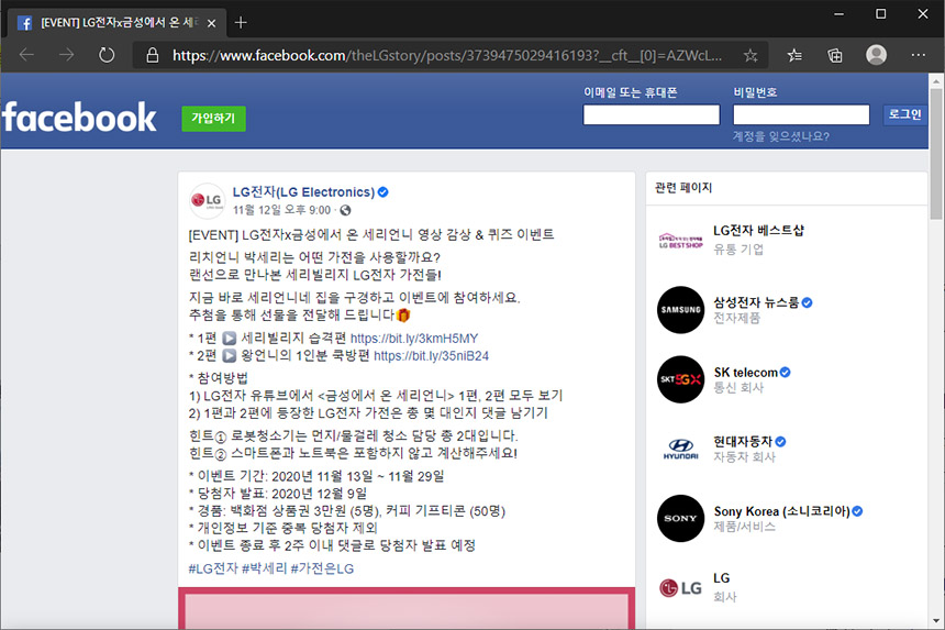 현재 LG전자 페이스북에서는 금성에서 온 세리언니 관련 퀴즈 이벤트를 진행하고 있습니다. 영상을 재미있게 보신 분들이라면 누구나 쉽게 맞출 수 있는 문제들이기 때문에 누구보다 빠르게 정답을 맞혀보시길 바랍니다.