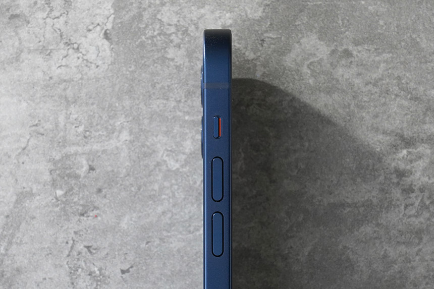 아이폰 12의 두께는 7.4mm로 슬림한 편입니다. 그리고 무게도 162g으로 일상적으로 사용하는데 부담스러운 편은 아니라고 생각되었습니다. 그리고 오른쪽에는 측면 버튼이 배치되어 있습니다.