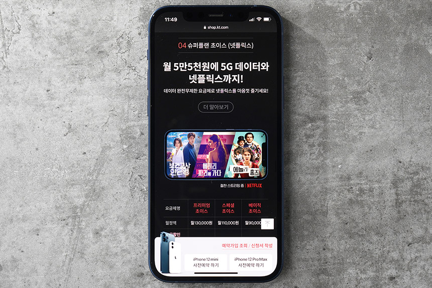 아이폰 12는 5G 스마트폰으로 제작되었습니다. 그래서 KT에서는 다양한 종류의 5G 요금제를 준비해 놓았습니다. 특히 제가 추천하는 요금제는 슈퍼플랜 초이스로 넷플릭스가 포함되어 있습니다.