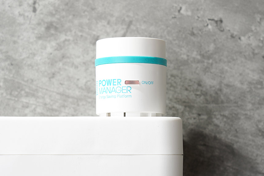 파워매니저 AI 스마트플러그는 콤팩트한 형태로 제작되었습니다. 그리고 저면에는 AI POWER MANAGER라는 문구와 함께 상태를 보여주는 LED가 내장된 스위치가 배치되어 있습니다.