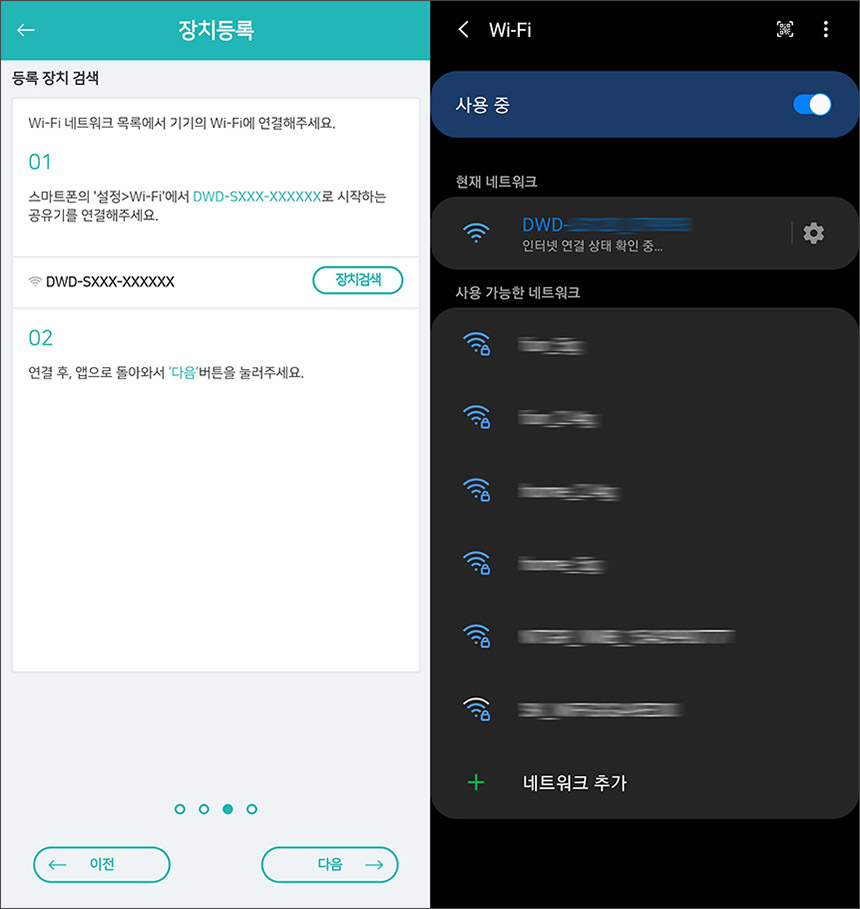 그리고 다음을 선택하면 스마트폰의 와이파이 메뉴에서 DWD-로 시작하는 공유기의 이름을 검색해서 연결해주면 됩니다. 그리고 일부 스마트폰은 인터넷에 연결되지 않으면 와이파이 연결을 해제하는 옵션이 있는데요. 계속 연결되어 있도록 설정을 변경해 주어야 합니다.