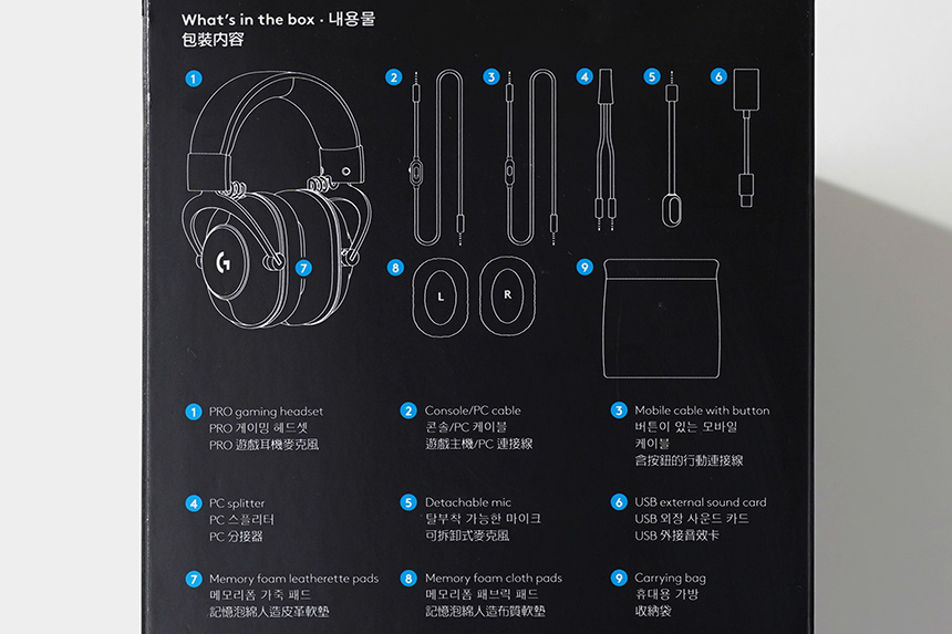 박스의 옆면에는 로지텍 G PRO X 헤드셋의 푸짐한 구성품이 설명되어 있습니다. 컴퓨터에서는 물론이고 스마트폰이나 다양한 장비에 연결해서 사용할 수 있도록 구성되어 있다는 점이 편리한 부분이라고 생각되었습니다.