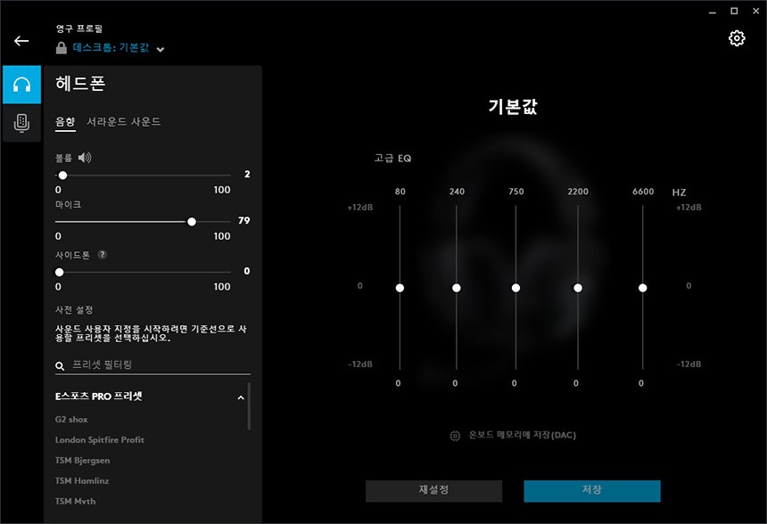 헤드폰의 음향 메뉴를 확인해 보면 E스포츠 선수들이 직접 튜닝한 사운드를 로지텍 G PRO X 헤드셋에 적용할 수 있는 기능들이 준비되어 있습니다. 그리고 온보드 메모리에 업데이트(DAC) 버튼도 준비되어 있습니다.
