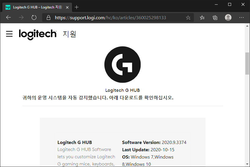 로지텍 G PRO X 헤드셋을 제대로 활용하기 위해서는 로지텍 G HUB라는 전용 소프트웨어가 필요합니다. 로지텍 홈페이지에서 다운로드 받을 수 있고 최신 버전은 2020.09.3374이고 자동 업데이트 기능도 지원합니다.