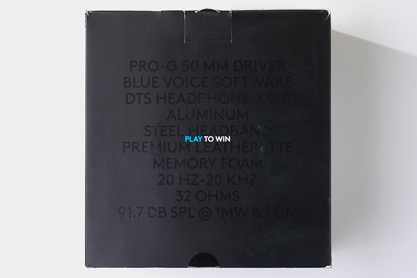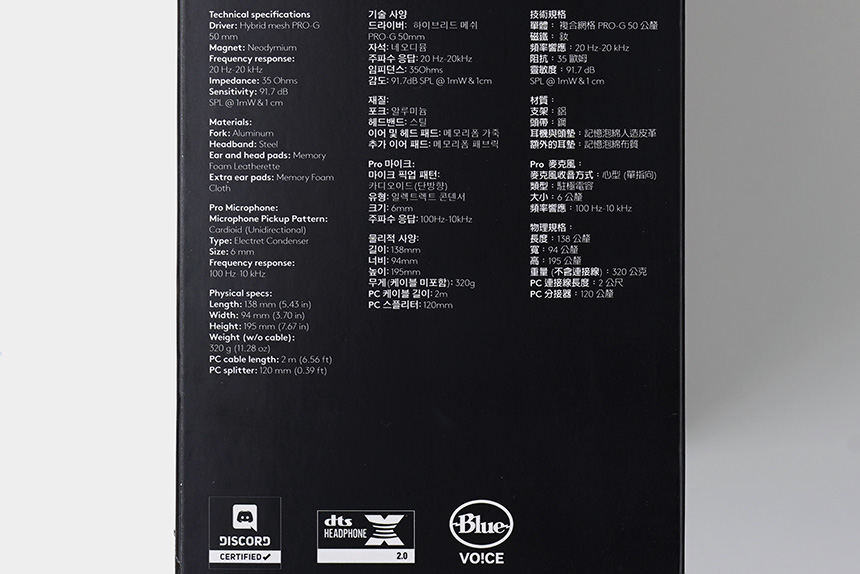 박스의 뒷면에는 로지텍 G PRO X 헤드셋의 주요 특징이 정리되어 있습니다. 주목할 만한 부분은 선명하고 정확한 소리를 제공하는 PRO-G 50mm 드라이버와 DTS HEADPHONE:X 2.0 7.1채널 서라운드 사운드 기술이 탑재되었다는 점입니다.
