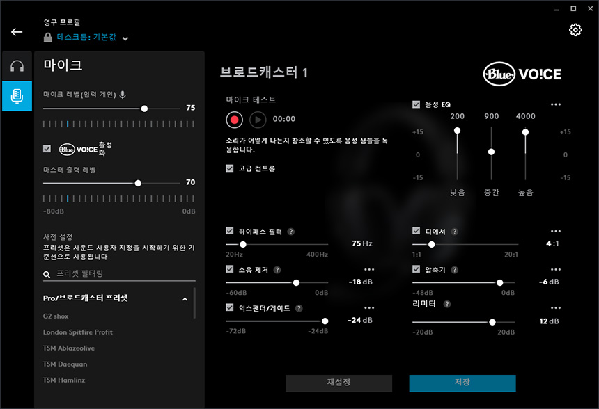 마이크 메뉴에서는 BLUE VO!CE 기능을 활성화할 수 있습니다. 다양한 프리셋을 제공하는 것은 물론이고 필터 들도 준비되어 있어서 자신의 취향에 맞게 목소리 음성을 출력할 수 있습니다.