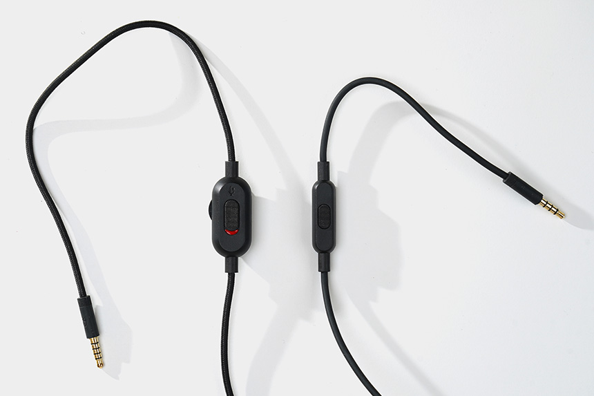 케이블은 총 2개가 제공되는데요. 콘솔/PC용은 마이크 음소거와 볼륨 조절 기능을 갖추고 있고 모바일용은 다양한 방식으로 활용할 수 있는 버튼이 부착되어 있습니다. 그리고 케이블의 소재도 각각 패브릭과 고무로 다르게 적용되어 있습니다.