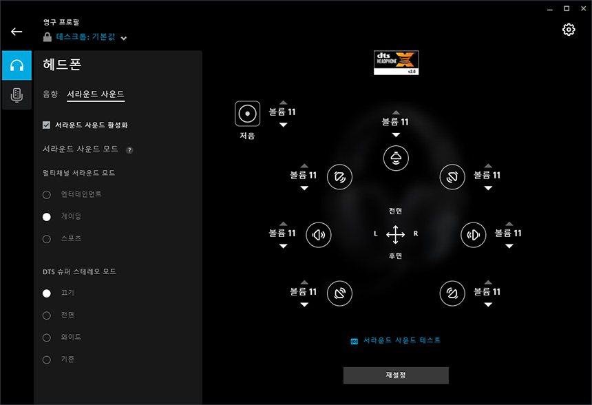 서라운드 사운드 기능을 이용하면 DTS HEADPHONE:X 2.0 기능을 이용해서 7.1채널로 사운드를 감상할 수 있습니다. 공간감이 훨씬 넓어지기 때문에 게임을 플레이하거나 영화를 감상할 때 유용합니다.