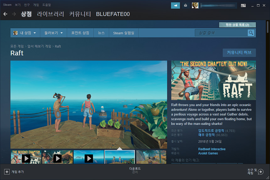 래프트(Raft)는 뗏목을 타고 망망대해를 이동하면서 생존하는 게임입니다. 중간에 섬으로 가서 자원을 획득하기도 하는 등 독특한 재미가 있습니다. 그렇지만 아직 게임 자체가 완성되지 않았고 혼자 플레이하는 것은 재미가 없기 때문에 같이 게임을 할 친구들이 필요합니다.