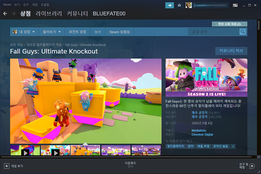 폴 가이즈(Fall Guys: Ultimate Knockout)는 대규모 멀티플레이 파티 게임으로 출발 드림팀과 같은 서바이벌 요소가 있는 게임입니다. 특히 캐릭터들이 아기자기하고 경쟁하는 재미가 있습니다. 최근까지만 하더라도 엄청난 인기가 있었습니다. 할인 가격은 16,400원입니다.