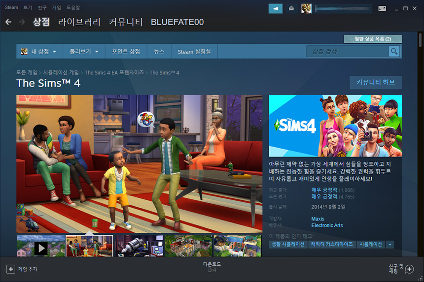 심즈 4(The Sims 4)는 말이 필요 없는 게임이라고 할 수 있습니다. 인류 자체를 시뮬레이션해 볼 수 있는데요. 높은 자유도를 자랑합니다. 그리고 할인 가격은 4,620원입니다.